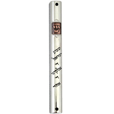 מזוזה ממתכת, גובה בית המזוזה מתאים לקלף שגובהו עד 12 סנטימטרים, המזוזה בצבע – – שמע ישראל