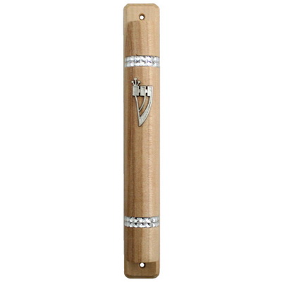 מזוזה מעץ, גובה בית המזוזה מתאים לקלף שגובהו עד 12 סנטימטרים, המזוזה בצבע חום בהיר שרשרת עם גב