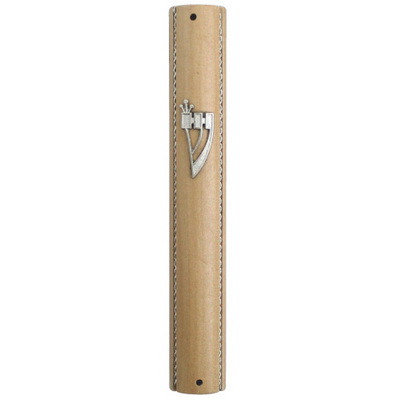 מזוזה מעץ, גובה בית המזוזה מתאים לקלף שגובהו עד 14 סנטימטרים, המזוזה בצבע חום בהיר שרשראות