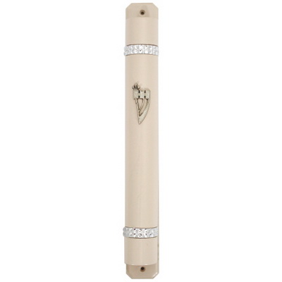 מזוזה מעץ, גובה בית המזוזה מתאים לקלף שגובהו עד 17 סנטימטרים, המזוזה בצבע אופוויט שרשראות עם גב