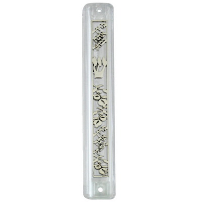 מזוזה מפלסטיק, גובה בית המזוזה מתאים לקלף שגובהו עד 10 סנטימטרים, המזוזה בצבע שקוף ויברכך פקק גומי